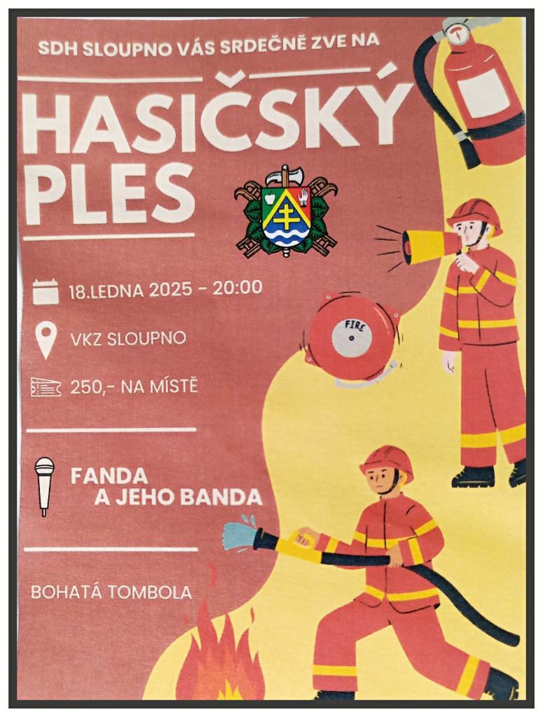 Tímto vás srdečně zveme do místní hospůdky VKZ ve Sloupně na již tradiční ples místních hasičů, který se uskuteční v sobotu 18. ledna 2025 od 20h. K poslechu i tanci bude hrát: "Fanda a jeho banda". Čeká na vás bohatá tombola i občerstvení. Těšíme se na vás.